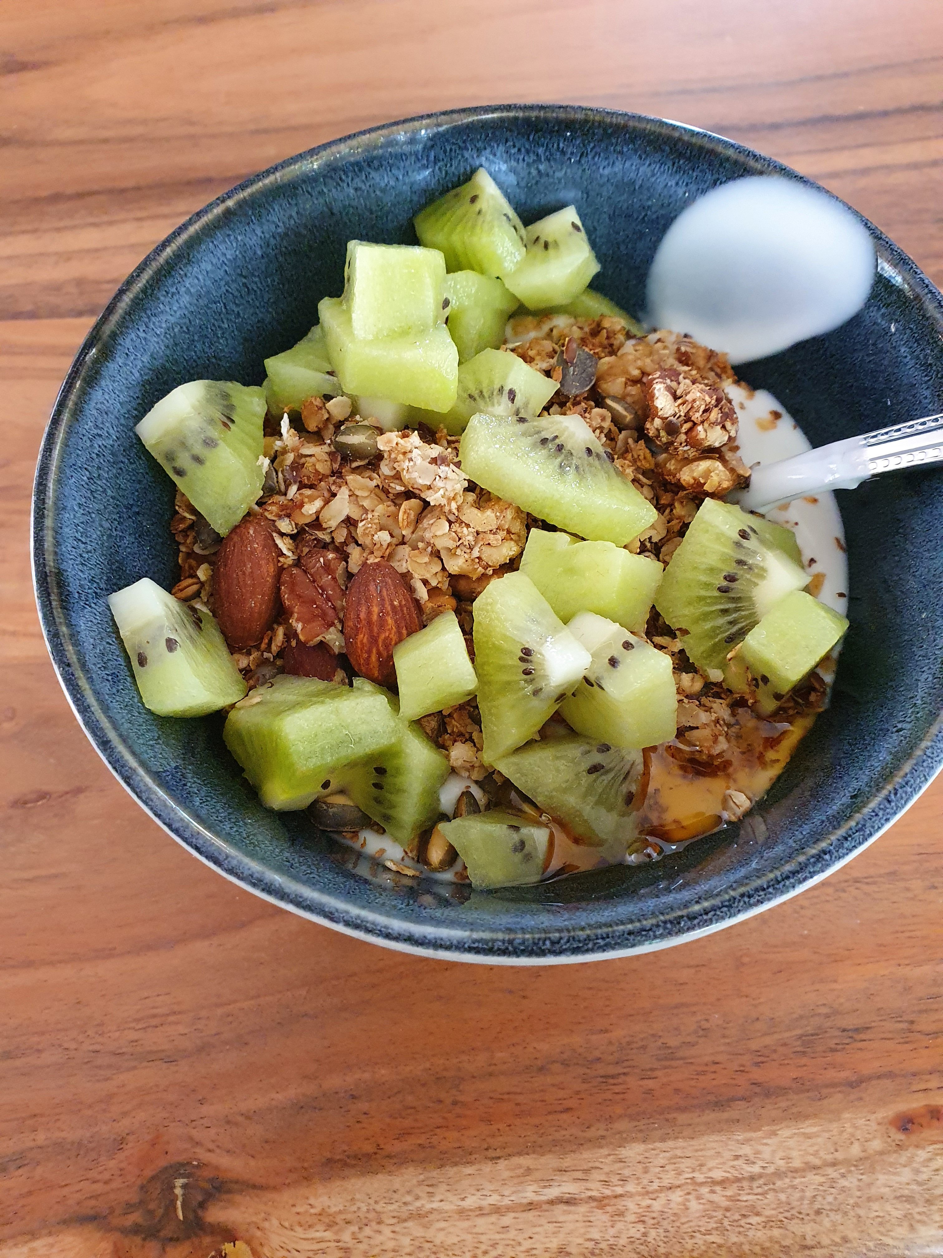 Ik maakte mijn favoriete granola weer eens. Het was lang geleden en ik was ook alweer vergeten hoe lekker ik hem vond. Maar toen hij in de oven stond en die heerlijke geur mij tegemoet kwam, wist ik het gelijk weer. En ik kwam eindelijk betaalbare verse aardbeien tegen, lekker met wat kokosyoghurt.